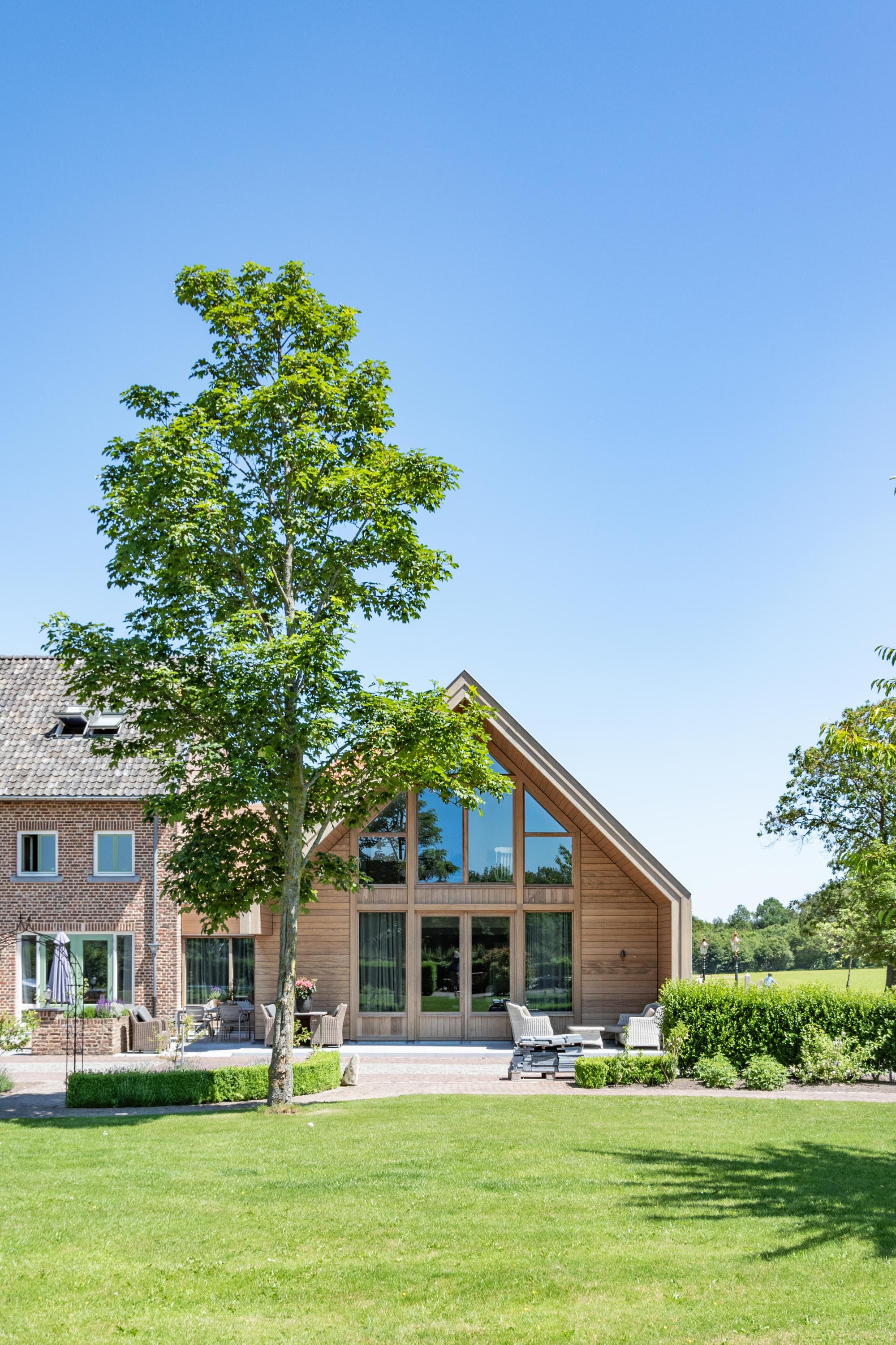 Het vernieuwde bouwvolume is compleet in hout uitgevoerd, inclusief de dakbedekking, en is eigentijds vormgegeven en ‘losgekoppeld’ van de bestaande carréboerderij.